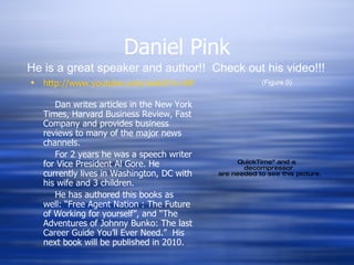 The document summarizes key points from Daniel Pink's book "A Whole New Mind" which argues that right-brain skills such as design, story, empathy, and finding meaning in work will be increasingly important in the future as jobs are outsourced or automated. It provides background on Pink and an overview of the 6 senses and right-brain skills that will be in high demand in the conceptual age, including examples of how businesses need employees with strong right-brain abilities.
