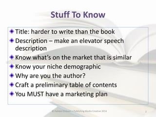 This document provides information on self-publishing and traditional book publishing. It discusses determining a book's niche, developing a marketing plan, and types of publishing including royalty, vanity/print-on-demand, and self-publishing. Details are given on how profits are shared in traditional publishing versus an author receiving all proceeds in self-publishing. Requirements for layout, printing quotes, and the publishing process are also outlined.