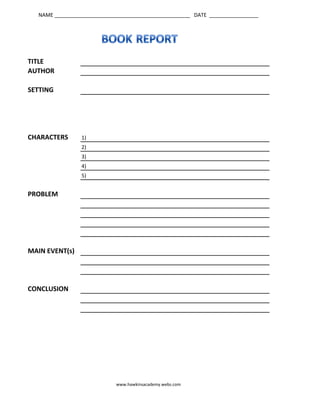 This document template provides guidance for analyzing and summarizing key elements of a story such as the title, author, setting, main characters, problem, events, and conclusion in 5 sentences or less. The template breaks down the essential components of a narrative and can help a student or reader effectively analyze and summarize the most important details.