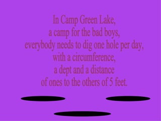 The document summarizes the plot of the novel "Holes" by Louis Sachar. It describes how boys at Camp Green Lake are forced to dig holes in the desert each day as punishment. The summary questions why the boys must dig, what is in the holes, and when they will stop digging. It concludes that the book conveys messages of perseverance and friendship, showing how friends will help each other in times of trouble.