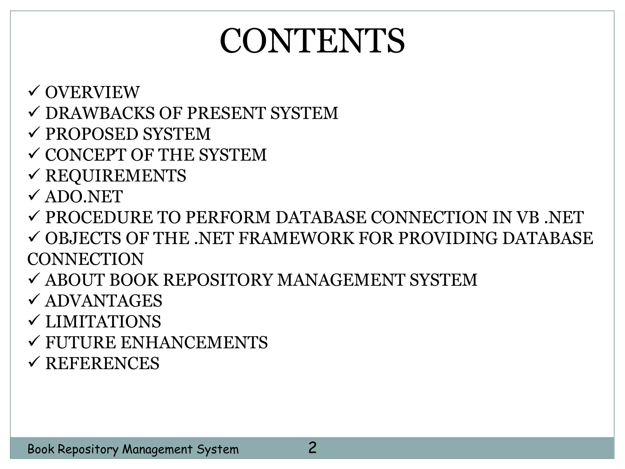 The document presents a book repository management system aimed at improving library management by addressing drawbacks of manual systems, such as inefficient report generation and lack of a central database. The proposed system includes stock maintenance, transaction entry, and reporting features to enhance user experience and reduce workload for employees. Future enhancements are suggested, including integration with online resources and improvements in data security.
