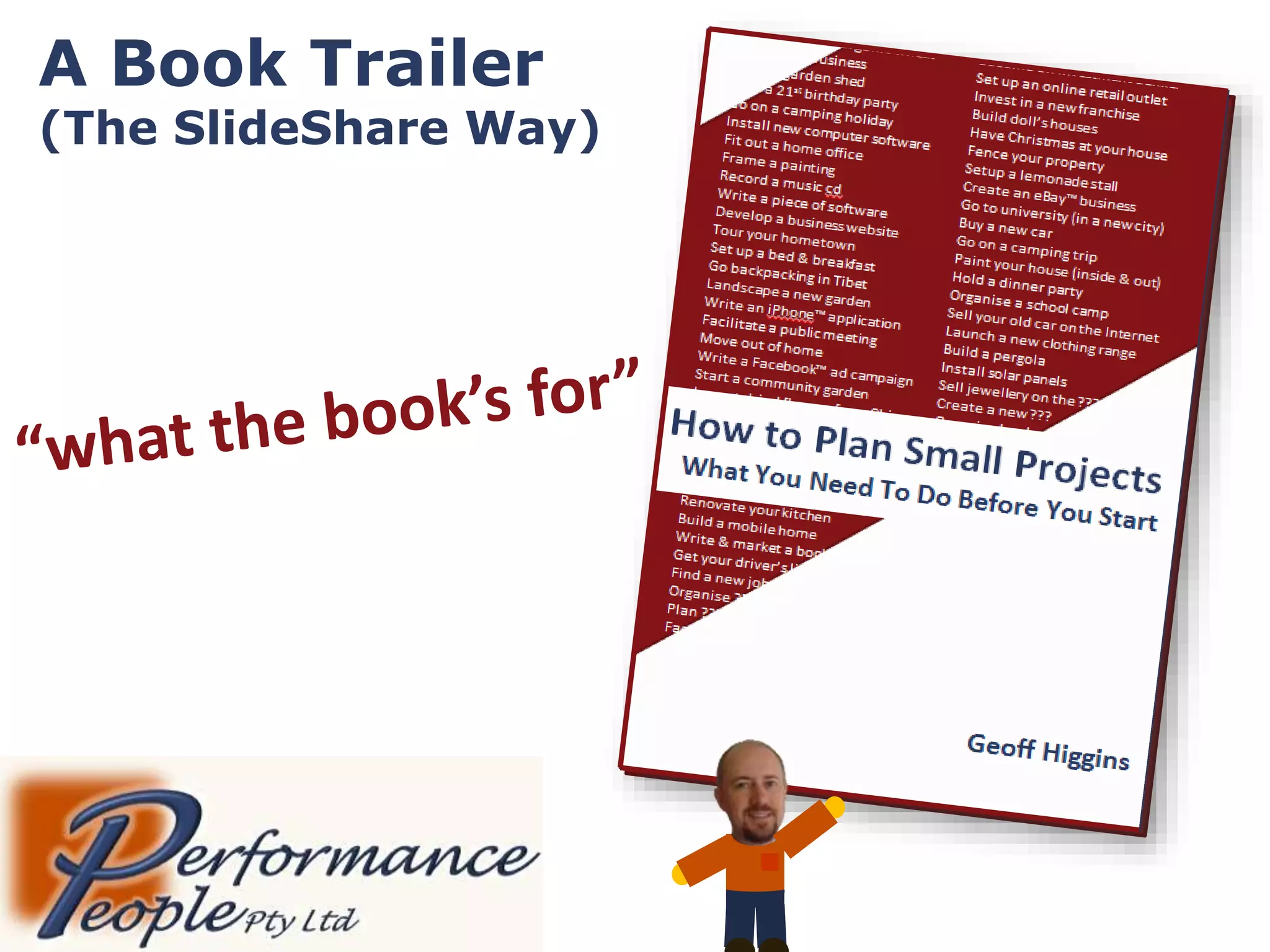 The document is a promotional book trailer for a guide on planning small projects. It distinguishes small projects from larger, more complex tasks and aims to assist individuals who feel intimidated by their projects. The book is targeted at those looking to undertake various small endeavors, with a focus on helpful planning strategies.