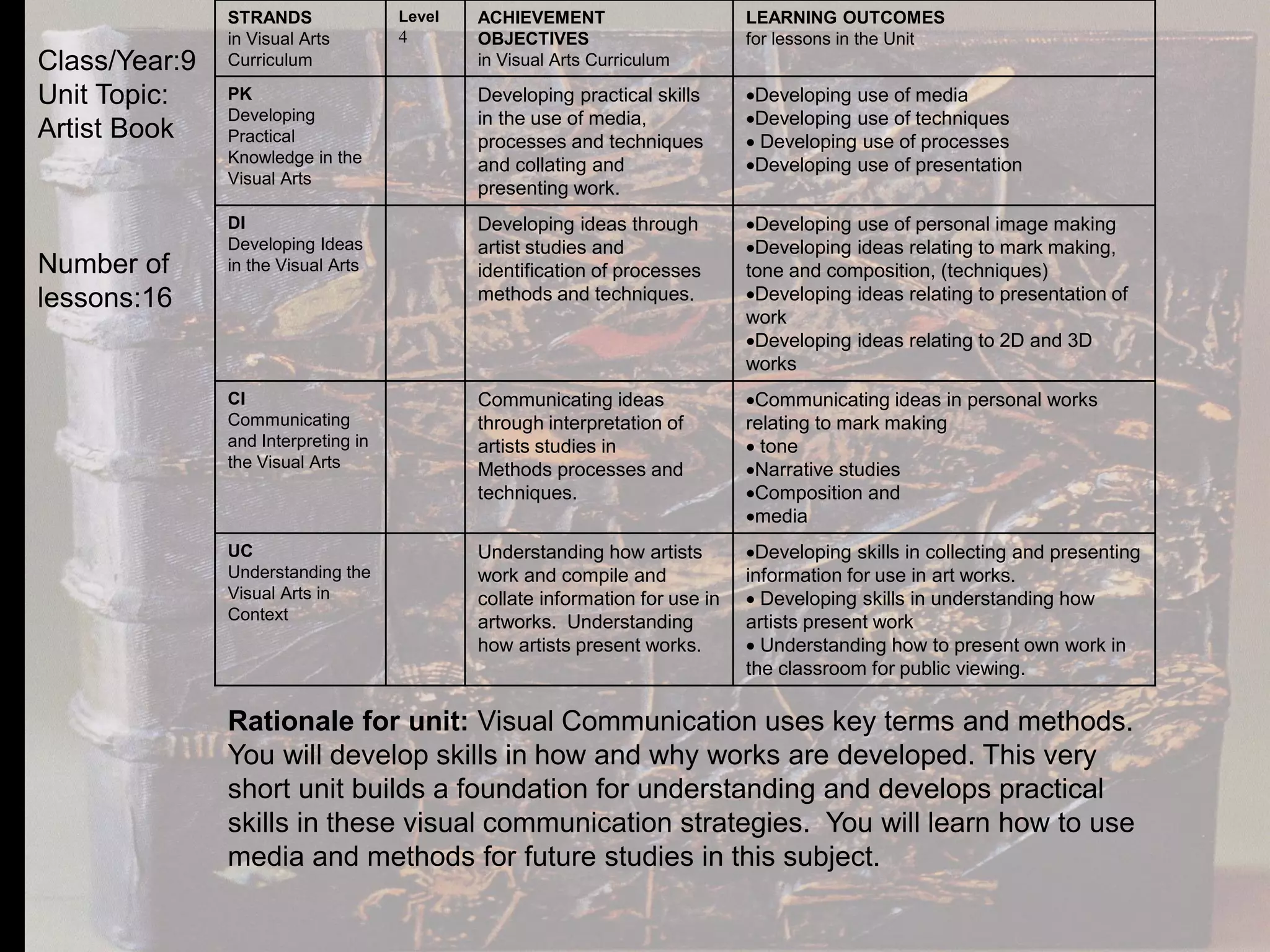 This 5-month course introduces students to creating an artist book. It has 16 lessons covering developing practical skills using media, processes, and techniques. Students will develop ideas through studying artists and identifying their use of mark making, composition, and presentation methods. They will communicate ideas in their personal works and understand how artists present their work. The goal is to build a foundation for visual communication strategies and practical skills to prepare students for further art studies.