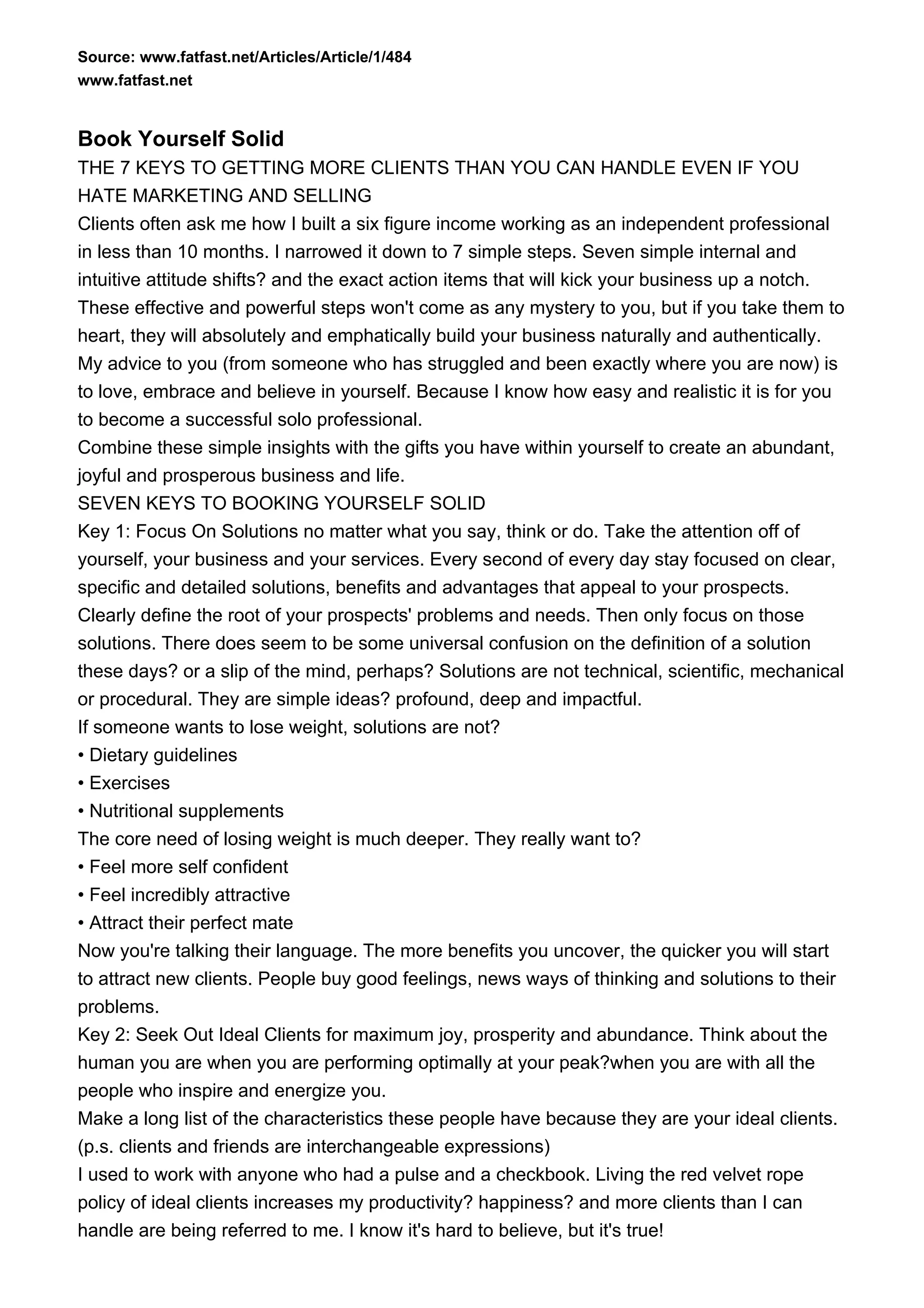 This document outlines seven keys to getting more clients than you can handle as an independent professional. The keys are: 1) Focus on solutions to client problems and needs, 2) Seek out ideal clients who inspire you, 3) Embrace your authentic self, 4) Develop a clear personal brand, 5) Articulate what you do clearly, 6) Use a simple selling process focused on solutions, and 7) Use self-promotion techniques like referrals and networking to find new clients. Taking these simple steps around attitude and action is said to naturally and authentically build business.
