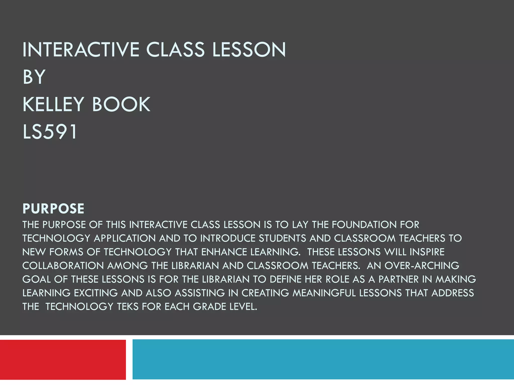 This document describes an interactive classroom lesson that introduces students and teachers to new technologies. The purpose is to enhance learning through collaboration between teachers and librarians. Students will explore websites, wikis, blogs, podcasts and mind mapping tools. They will learn responsible computer usage and how to evaluate information found online.