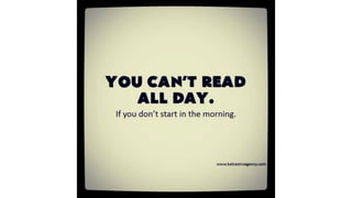 The document summarizes the origins and guidelines of #bookaday challenges, which encourage readers to read one book per day and share their thoughts on social media. It began in 2009 as an individual challenge by Donalyn Miller, and expanded in 2010 with the #bookaday hashtag. The challenges have benefits like celebrating reading, expanding one's knowledge of books, and connecting with an online reading community.