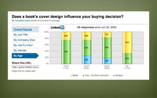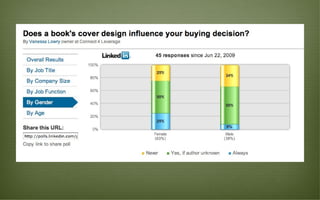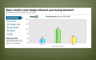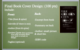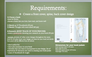 The document discusses the importance of book cover design. An effective cover needs to catch a reader's eye and convey the book's idea in a unique and creative way. A well-designed cover can generate excitement and influence purchasing decisions, as readers typically spend only a few seconds browsing before choosing a book. Both the front and back covers are important, with the back cover providing more space for summarizing the content and including endorsements. The design should appeal to the target audience and reflect the book's topic. Typography and combining different design elements are also discussed.