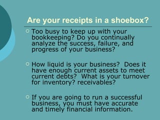 Keeping accurate financial records is essential for running a successful small business. Good records allow business owners to monitor the financial performance and profitability of the business, make informed decisions, obtain financing, prepare tax filings, comply with payroll regulations, and determine distributions to owners. Without proper record keeping, business owners risk making poor decisions, paying unnecessary taxes and penalties, and not having the financial information needed to expand or obtain capital. It is recommended that small business owners hire an accountant or bookkeeping service to properly maintain their financial records.