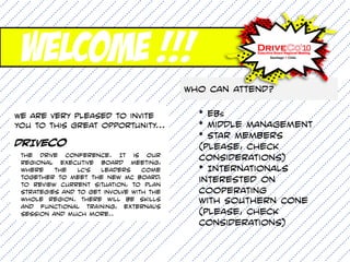 This document provides an agenda and logistical information for a regional cabinet meeting in Santiago, Chile from August 6-8. The meeting will bring together leaders from the region to meet the new management committee board, review the current situation, plan strategies, and opportunities for skills development and collaboration between locations. Attendees can choose from tracks focused on functional areas or clusters. The event will be held at the Blue Tree Hotels Fundador location and include workshops, presentations, and social activities. Travel and accommodation details are provided.