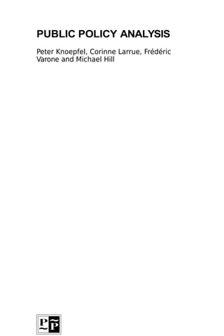 This document provides a summary of a public policy analysis manual. The manual presents a framework for analyzing public policies that was developed based on research and teaching experience in France, Switzerland, and the UK. It introduces key concepts from various social sciences and presents a model for analyzing the different stages of the policy process, including agenda setting, programming, implementation, and evaluation. The goal is to provide students and practitioners with a tool that can be used to empirically study existing public policies or develop new ones. The manual illustrates the model using examples from different government systems, highlighting both common elements and unique features of public action across countries.
