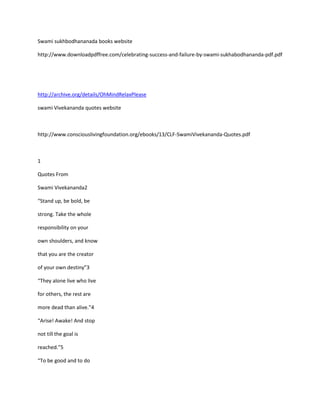 This document contains a collection of inspirational quotes from Swami Vivekananda. Some of the key messages conveyed in the quotes include empowering individuals to take responsibility for their own destiny, the importance of self-belief and willpower, avoiding weakness and helping others. The quotes encourage living for others, developing character over wealth or fame, and maintaining composure in the face of provocation.