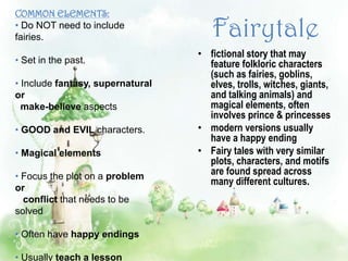 This document summarizes the common elements of fairytales and folktales. Fairytales typically feature magical elements, good and evil characters, and focus on solving a problem or conflict, often with a happy ending. They may also teach a lesson. Folktales originate through oral tradition, take place in the past, and feature talking animals or mythical creatures to explain the world. They also reflect cultural values and caution about behaviors. Both fairytales and folktales are fictional stories passed down across generations.