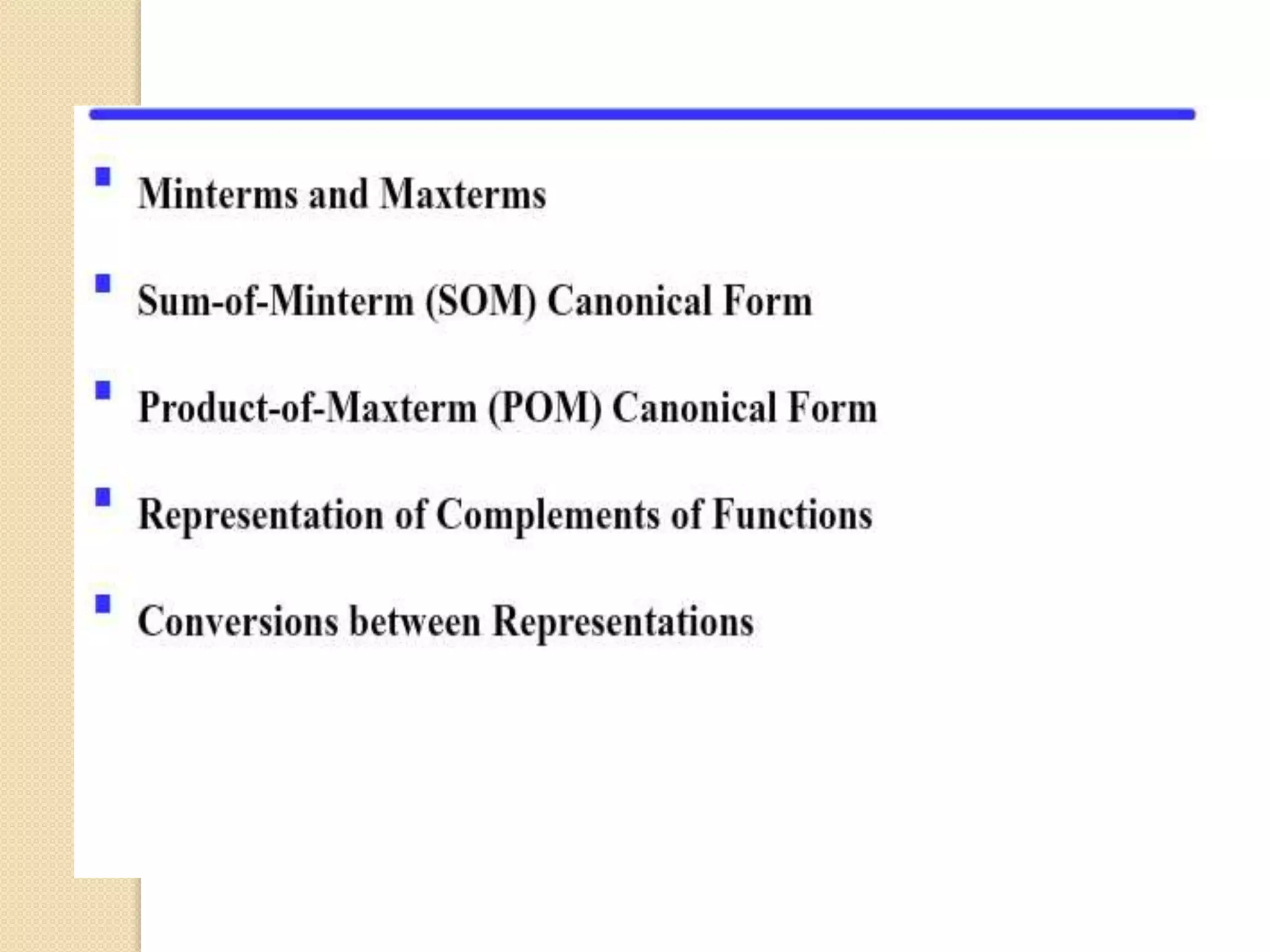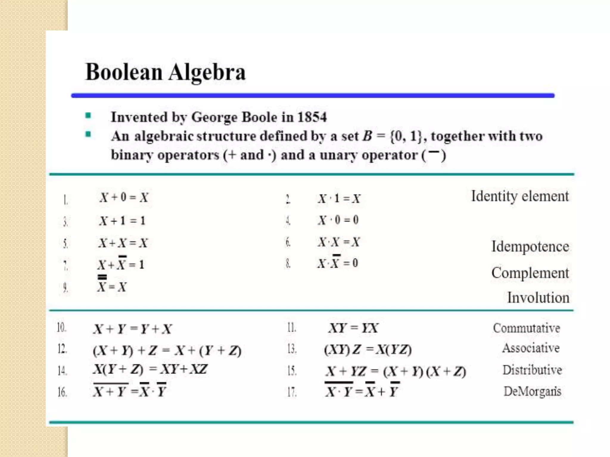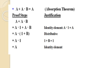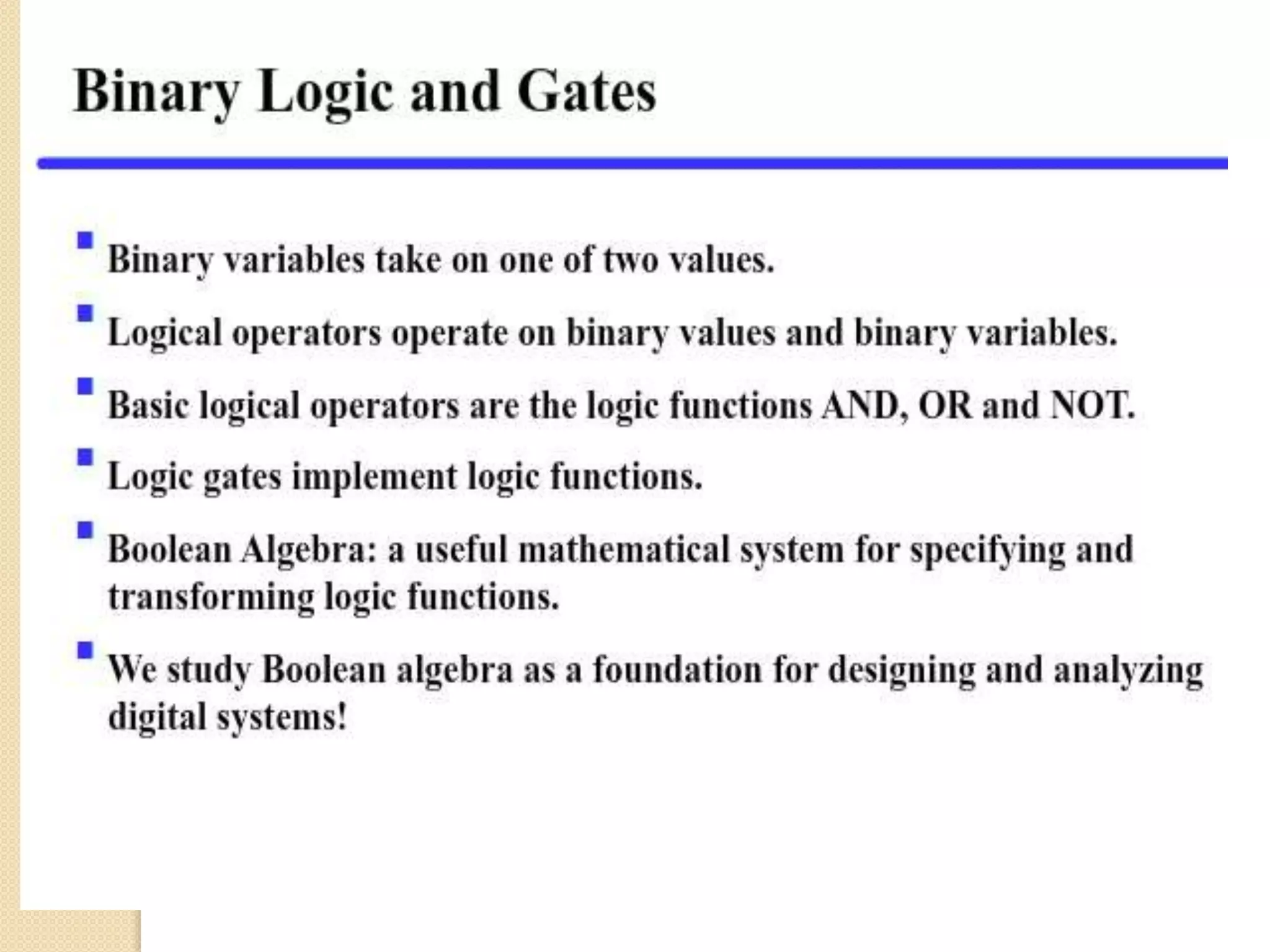 This document provides an introduction to Boolean algebra and its applications in digital logic. It discusses how Boolean algebra was developed by George Boole in the 1800s as an algebra of logic to represent logical statements as either true or false. The document then explains how Boolean algebra is used to perform logical operations in digital computers by representing true as 1 and false as 0. It introduces the basic logical operators of AND, OR, and NOT and provides their truth tables. The rest of the document discusses topics such as logic gates, truth tables, minterms, maxterms, and how to realize Boolean functions using sum of products and product of sums forms.