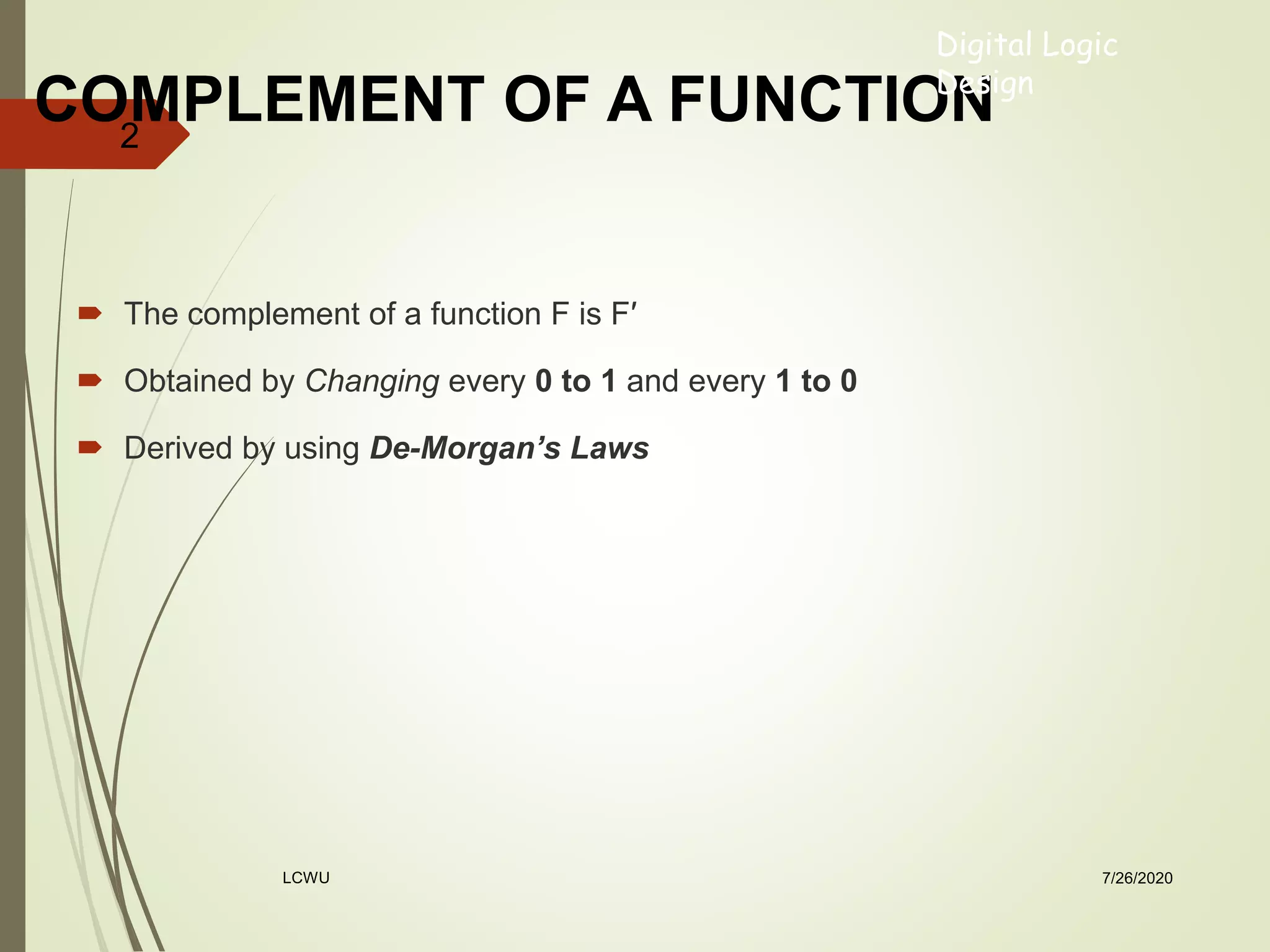 This document discusses Boolean algebra and logic gates. It defines the complement of a function as changing all 0s to 1s and vice versa. De Morgan's laws are introduced, which allow complementing both sides of an equation. Circuits are represented using diagrams of logic gates and their inputs and outputs. Standard forms for representing Boolean expressions include sum of minterms and product of maxterms, which are defined as the ANDing and ORing of variables respectively. Minterms and maxterms are demonstrated using truth tables for two variables. The relationship between minterms and maxterms is that each equals the complement of the other.