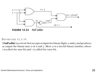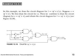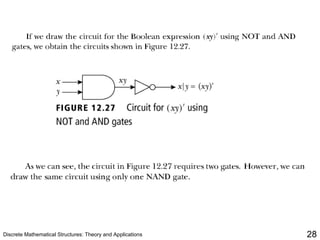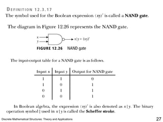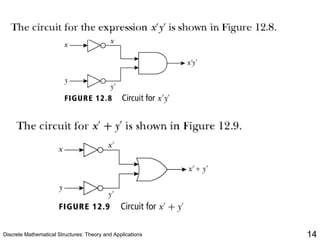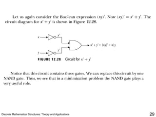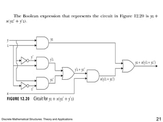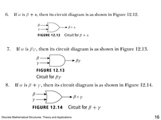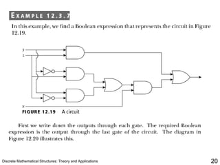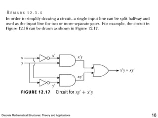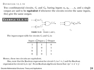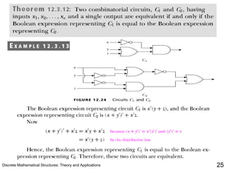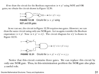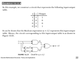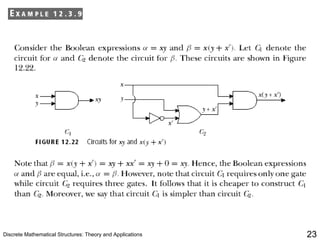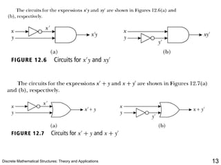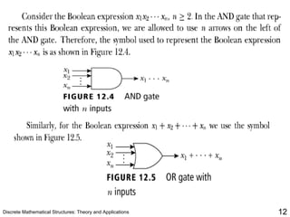The document discusses Boolean algebra and its applications in electronic circuits. It covers learning objectives around Boolean expressions, properties of Boolean algebra, and using Boolean algebra in switching circuits and logical gates. The basic gates are introduced as NOT, AND, and OR, and it is explained that any combinatorial circuit can be designed using combinations of these gates, where the output depends only on the current inputs.
