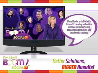 This document outlines the services of a social media marketing agency, including planning and implementing social media strategies and monitoring analytics for selected clients. It also provides various social media profiles and websites for staying up to date with the agency's activities and community.