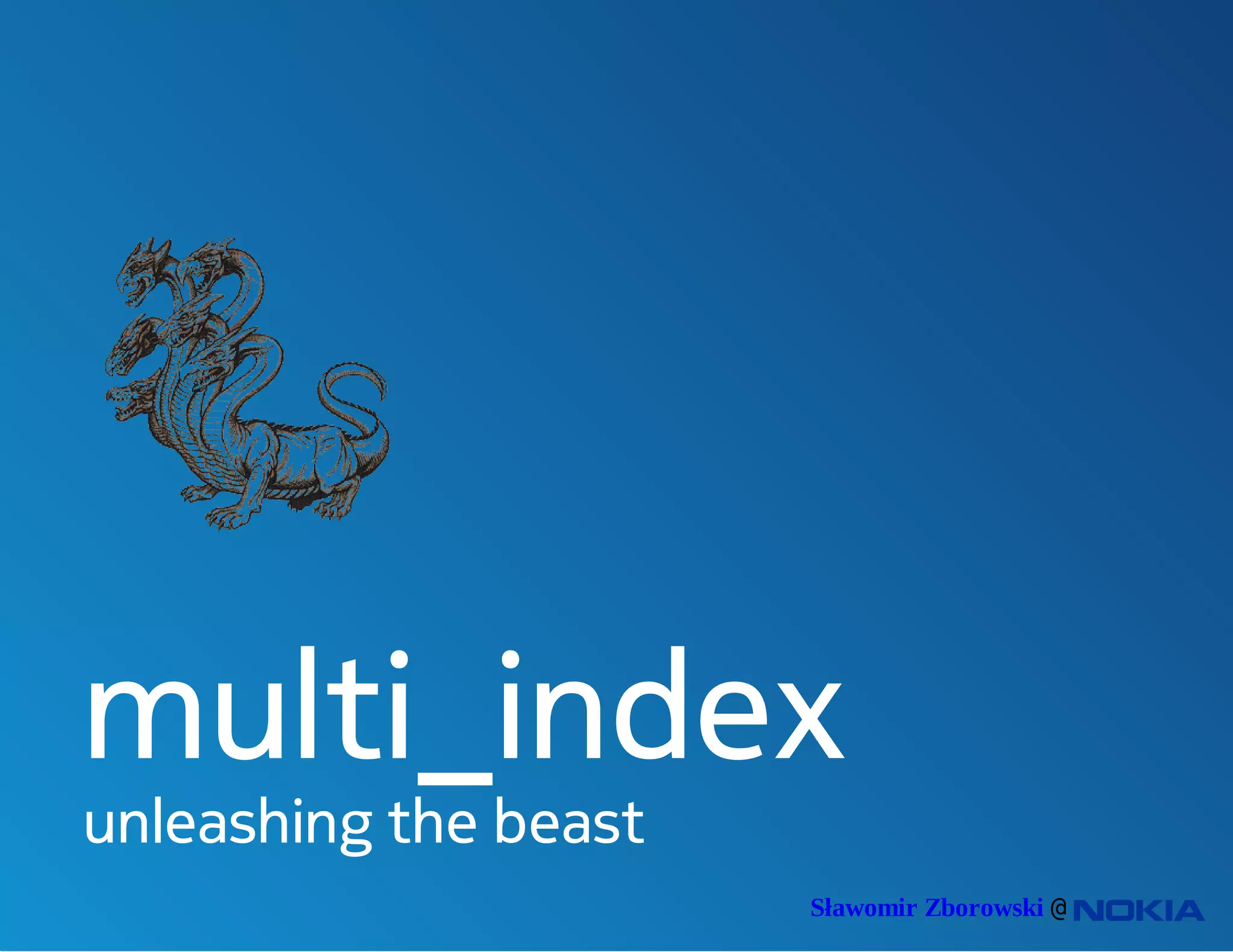Boost::multi_index allows storing and accessing data in multiple ways simultaneously by maintaining multiple indices. It can index the same data by different fields, like id and name, without needing to duplicate or synchronize data. Users define the indices upfront, such as ordered by id and name. This allows efficient lookup and iteration by either field without additional containers or synchronization. Boost::multi_index provides common index types like ordered and hashed indices as well as tools to extract keys from objects. It offers powerful and flexible indexing of data.