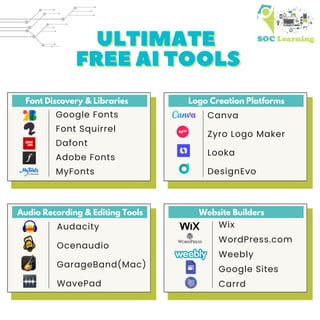 The document lists various design, creativity, and productivity tools, including platforms for graphic design like Canva and Figma, writing assistance tools such as ChatGPT and Google Docs, as well as website builders and audio editing software. It highlights ultimate free AI tools and resources for logo creation, video production, and SEO tools. The document serves as a comprehensive guide for individuals seeking effective tools for creative and professional endeavors.