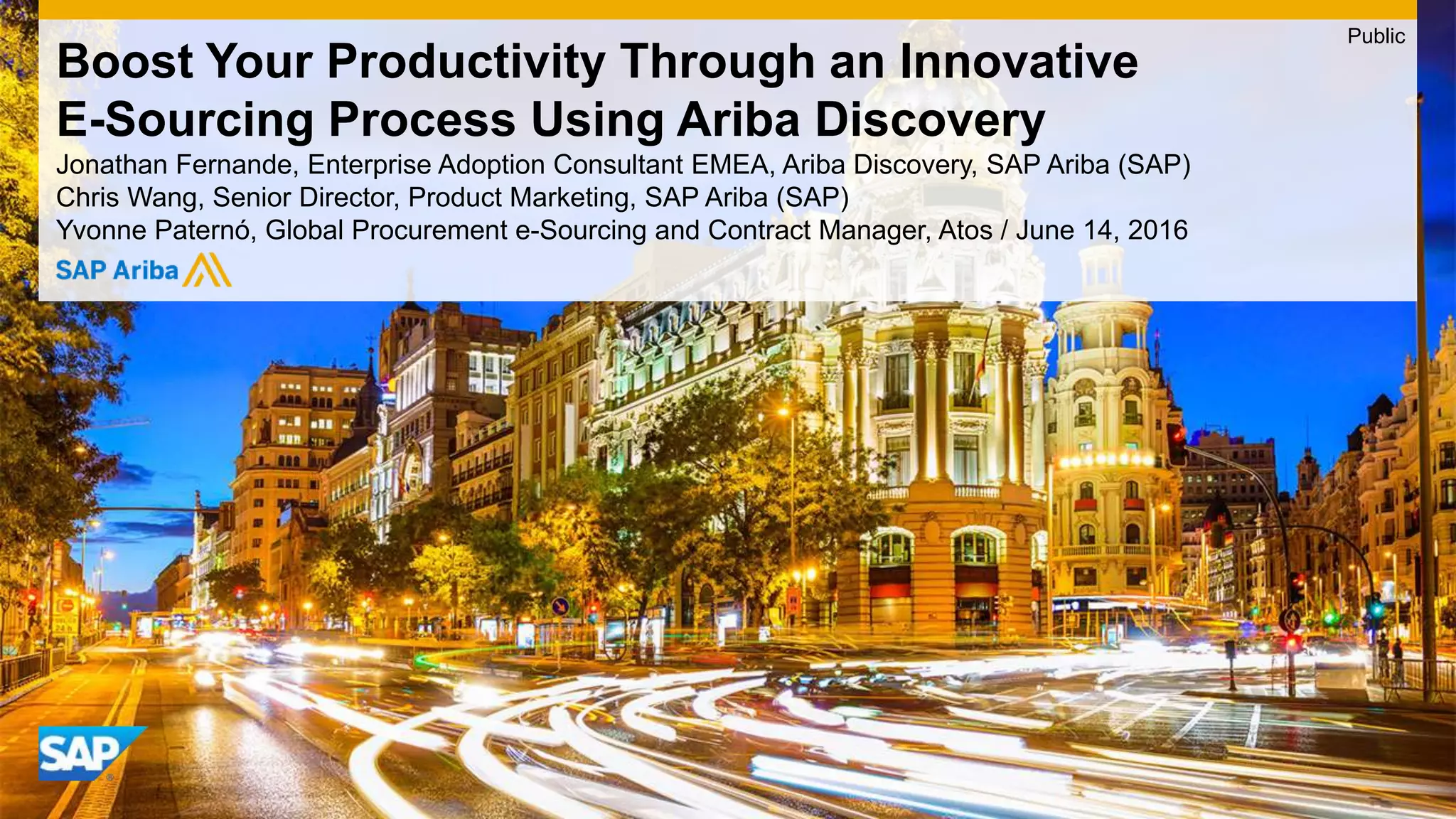 The document focuses on the SAP Ariba Discovery platform, highlighting its role in enhancing B2B e-commerce through supplier discovery and procurement solutions. It emphasizes the growth of B2B e-commerce, projected to reach $12 trillion by 2020, and outlines the process of connecting buyers with suppliers more efficiently. Key benefits include time savings, cost reductions, and improved quality of procurement through enhanced supplier matching and engagement.
