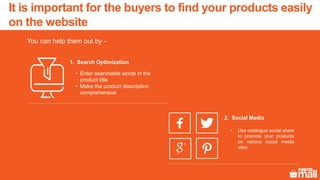 This document provides tips to boost sales by focusing on seven key areas: discoverability, pricing, communication, shipping timeliness, packaging, seller ratings, and customer delight. It discusses optimizing product listings, using search and social media to promote products, setting competitive pricing, bundling products, improving product images and catalog, fulfilling orders on time, using proper packaging, monitoring ratings, and surprising customers with freebies. The overall goal is to make products easy for customers to find, understand, and receive while delivering a positive purchasing experience.