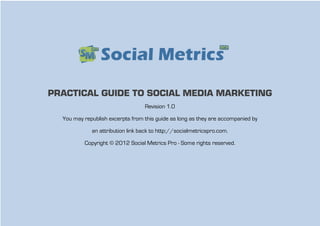 This document provides a guide to social media marketing. It discusses setting up and optimizing profiles on major social media platforms like Facebook, Twitter, and Google+ to promote brands and drive traffic to websites. Specific tips for Facebook marketing include creating a Facebook page for brands, optimizing the page for search engine optimization, and integrating Facebook sharing options on blogs. The guide also provides tools and best practices for social media marketing on each platform.