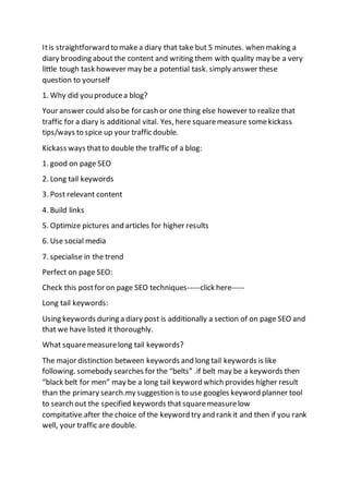 1. The document provides tips for doubling blog traffic, including optimizing on-page SEO, using long-tail keywords, posting relevant content, building links, optimizing images and articles, using social media, and focusing on trending topics.