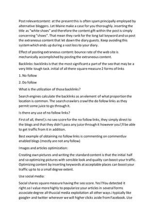 2. It emphasizes the importance of on-page SEO, using long-tail keywords to target low competition keywords, and avoiding posting irrelevant content which can hurt bounce rates.