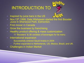 Booster Juice aimed to bring Canadian smoothies to India but faced challenges achieving success. While franchising was an optimal entry strategy, some marketing mix elements like location selection and pricing were inefficient for the Indian market. A transnational strategy balancing localization and standardization would be best, as Indians have distinct situations from McDonald's but similar target consumers. The strategy should find a balance between globalization and localization through localized promotion and an integrated value chain while maintaining Booster Juice's premium brand image.