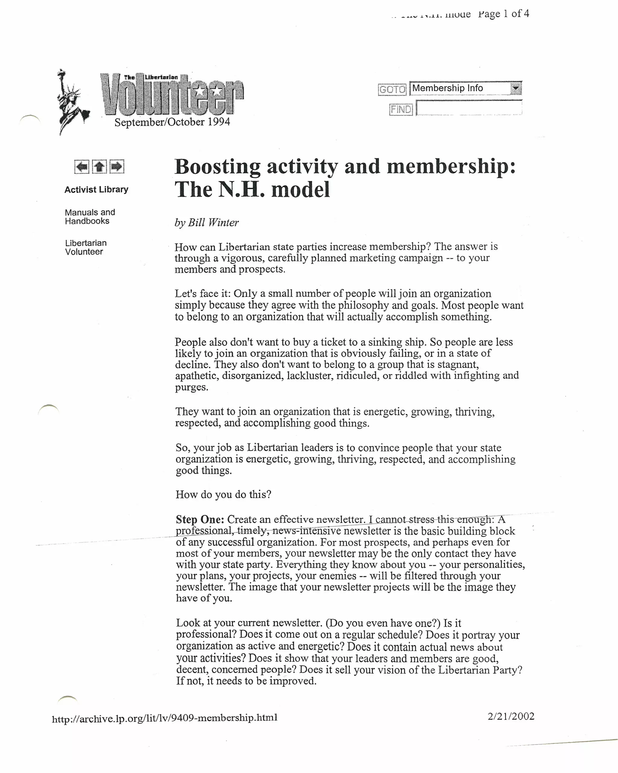 3. Use the newsletter to advertise and promote the projects to members and prospects, showing the party is active.