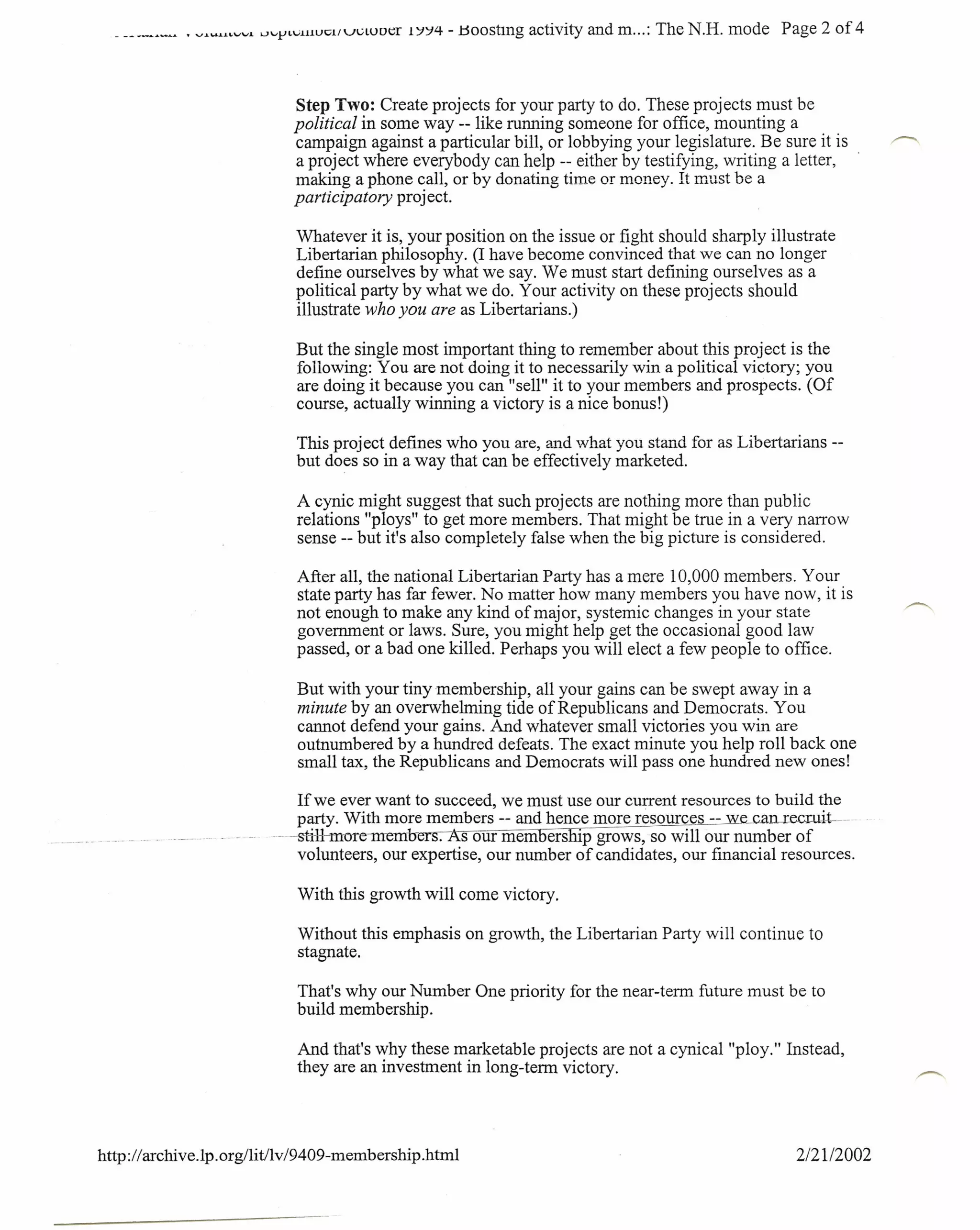 2. Launch political projects for members to participate in that illustrate Libertarian goals.