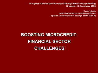 The document discusses the challenges faced by microcredit in Spain, highlighting statistics from 2007 regarding loans, interest rates, and recipient profiles. It outlines the role of the Spanish Confederation of Savings Banks in microcredit agreements and emphasizes the need for an integrated microcredit policy to foster growth in the sector. The potential impact of the financial crisis on microcredit's effectiveness for social inclusion and entrepreneurship is also examined, alongside the necessity for coordinated efforts among governmental bodies to build a viable microfinance sector.