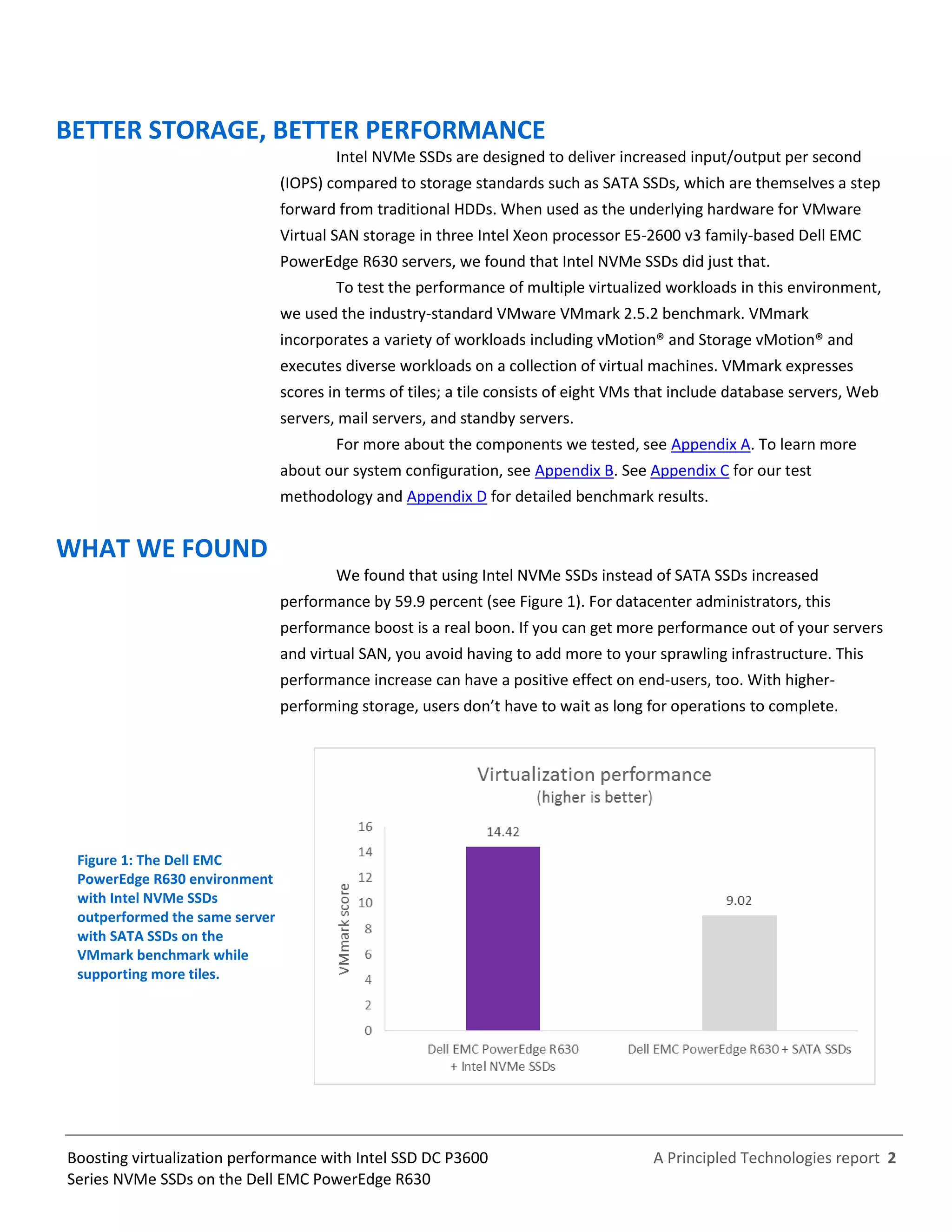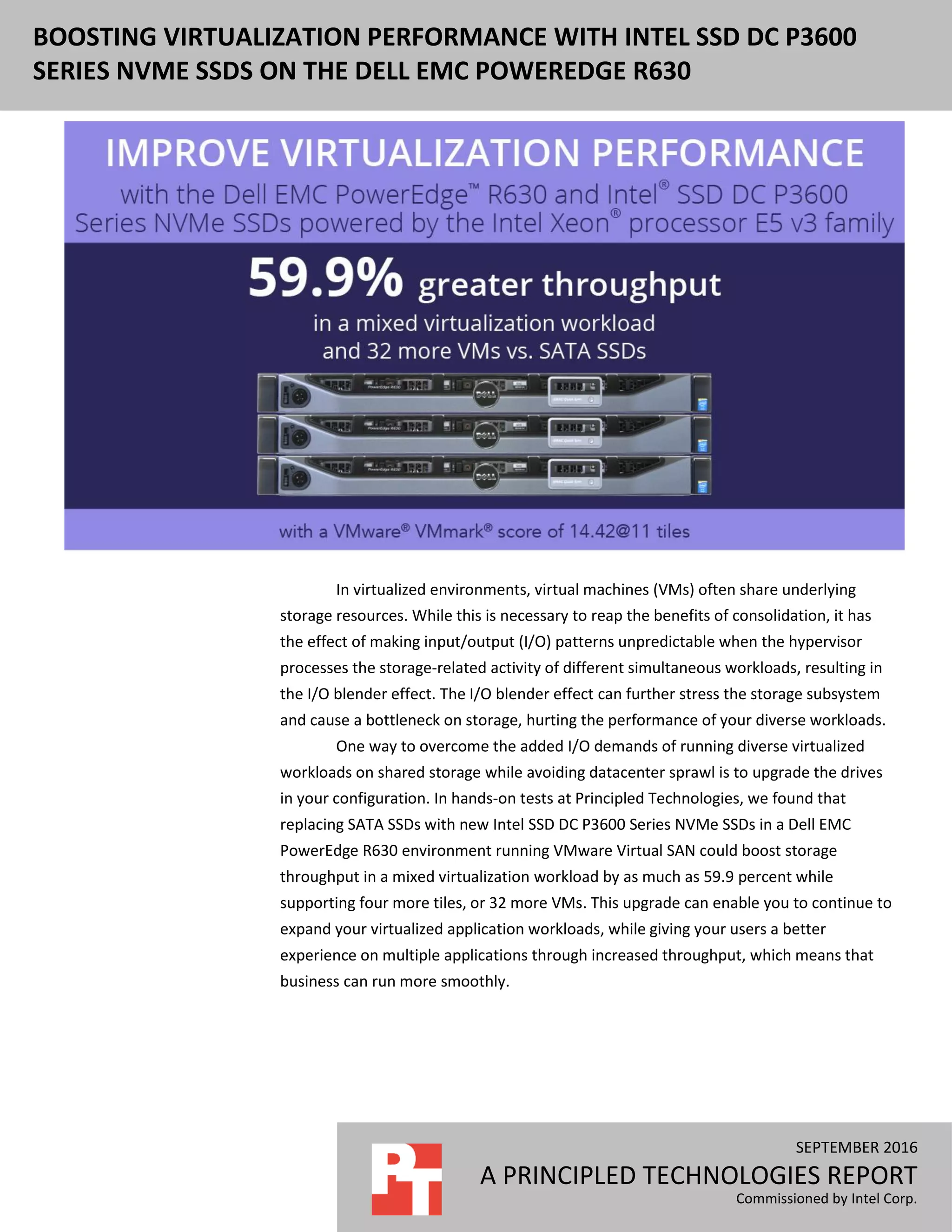 The report evaluates the performance of Intel SSD DC P3600 series NVMe SSDs in a Dell EMC PowerEdge R630 server running VMware Virtual SAN, demonstrating a 59.9% increase in storage throughput compared to SATA SSDs in a mixed virtualization workload. This upgrade allows for greater support of virtual machines, enhancing performance without the need for additional infrastructure, thus benefiting users with reduced wait times and improved service. Overall, switching to Intel NVMe SSDs provides significant operational advantages for virtualized environments.