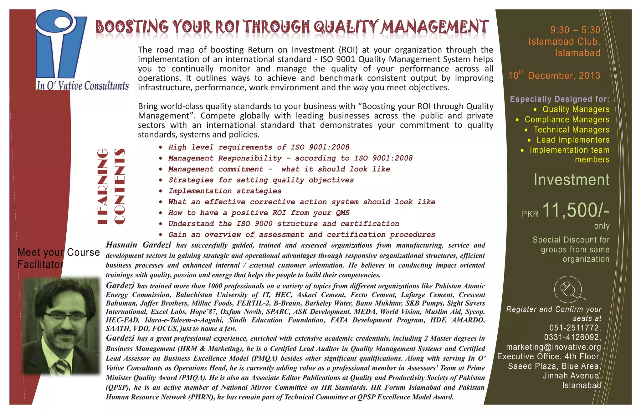The document discusses implementing an ISO 9001 Quality Management System to improve return on investment. It states that ISO 9001 helps continually monitor and manage quality across operations by improving infrastructure, performance, work environment, and how objectives are met. Adopting ISO 9001 standards demonstrates a commitment to quality and allows an organization to compete globally with leading public and private sector businesses.