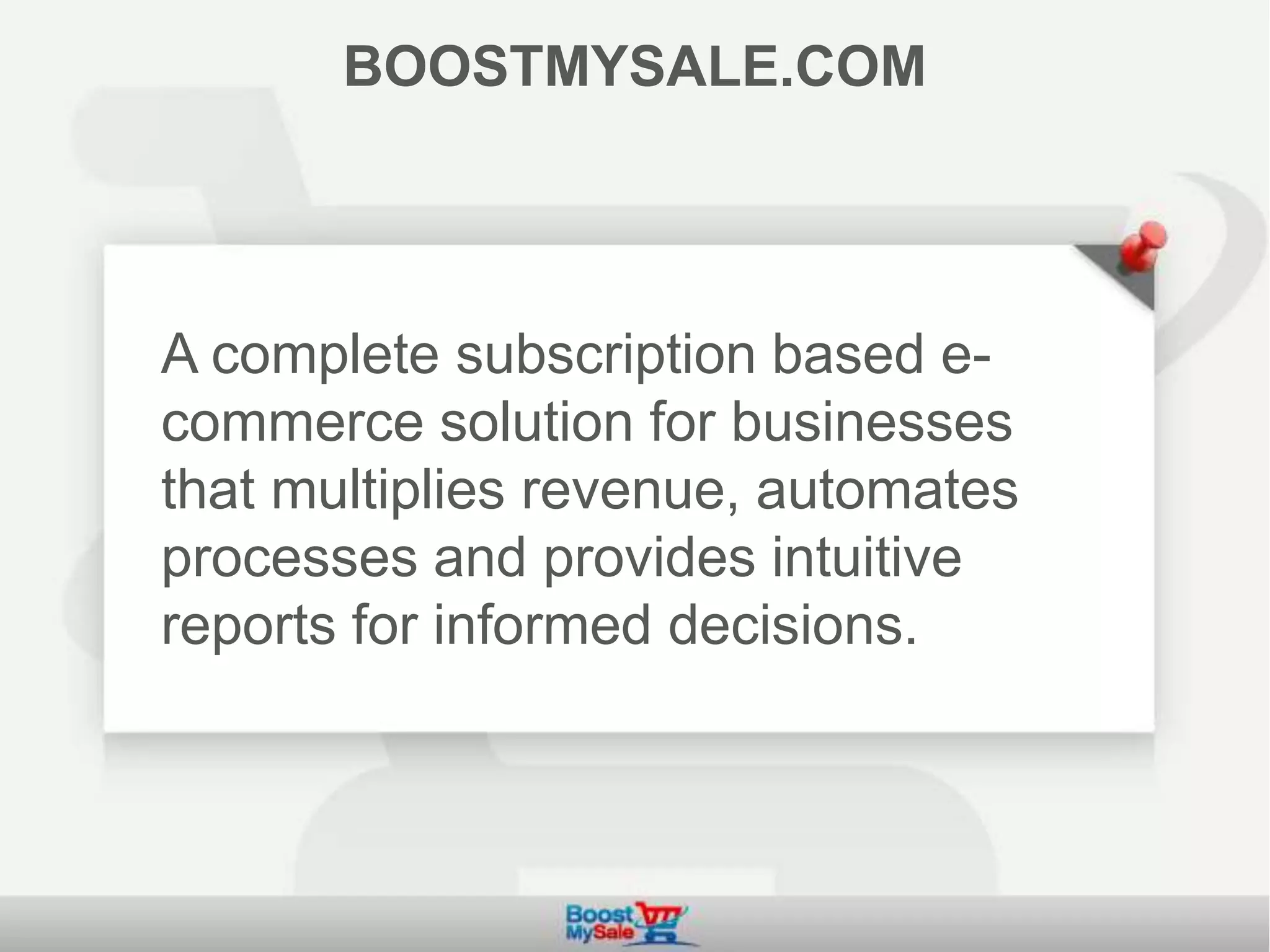 This document summarizes an e-commerce solution called BoostMySale that provides a complete, integrated platform for online retailers. It manages product listings, orders, and inventory across multiple sales channels. The platform aims to automate processes, provide business reports, and address pain points of existing piecemeal solutions. It serves over 500 customers monthly and has experienced strong growth through new customers and integrated marketing tools.