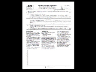 The document provides guidance on creating a non-profit organization as an artist, including deciding whether to create an independent non-profit or work under an existing organization, incorporating at the state level, applying for 501(c)(3) status, forming boards, opening a bank account, assigning tasks, developing bylaws and articles of incorporation, working with legal and tax professionals, and ongoing financial reporting requirements.
