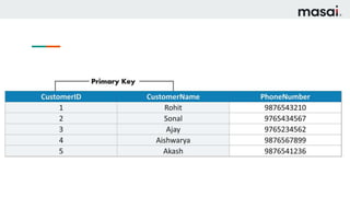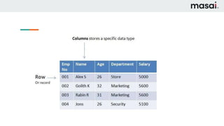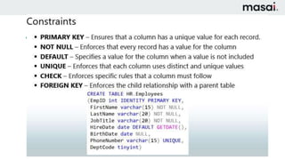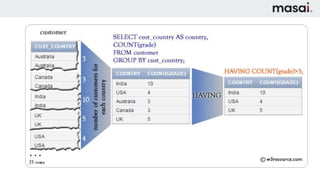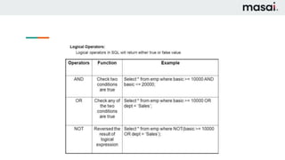 3. Key topics include retrieving single and multiple columns, filtering rows with WHERE, sorting with ORDER BY, and limiting results with LIMIT. Aggregation, GROUP BY, and HAVING are explained for summarizing data across groups.