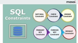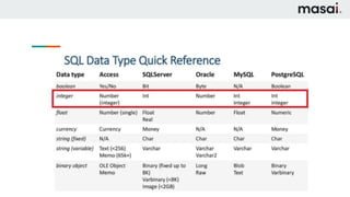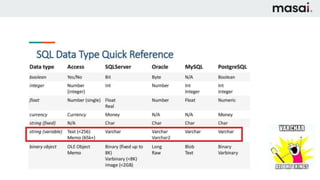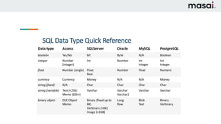 2. The document covers fundamental SQL concepts like SELECT statements, WHERE clauses, JOINs, data types, aggregation functions, and table creation/modification.
