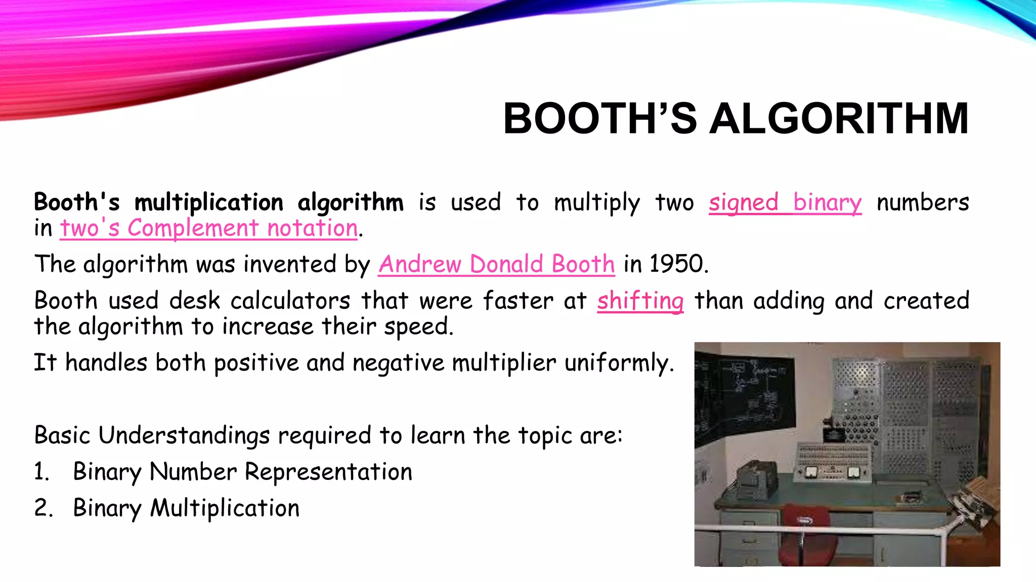 Booth's algorithm is a method for multiplying two binary numbers, including positive and negative numbers, by recoding the multiplier into {-1, 0, +1} and then multiplying the multiplicand by the recoded bits. For example, to multiply the positive numbers +13 and +7 in binary, the document shows recoding +7 as 0+1-1, multiplying +13 by each recoded bit, and adding the results to get the product of 91. The algorithm was created by Andrew Booth to speed up multiplication on early calculators.