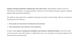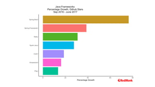 This document outlines the presentation by Matt Raible on 'Bootiful Development with Spring Boot and React', covering topics like Spring Boot features, React development, and Progressive Web Apps (PWAs). It emphasizes the advantages of Spring Boot for microservices and provides various code snippets and resources for further exploration. The presentation also highlights the growth and popularity of JavaScript frameworks such as Angular and React, along with tools for building modern web applications.