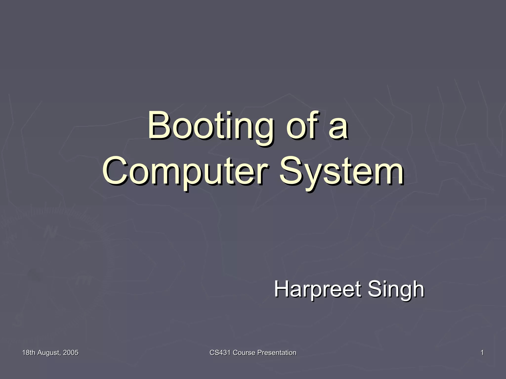 This document discusses the booting process of a computer system. It explains that booting is required because hardware does not know where the operating system resides or how to load it. A bootstrap loader, such as BIOS, locates the kernel and loads it into memory to start execution. The boot process begins with a reset event that loads a bootstrap program from read-only memory (ROM) into random access memory (RAM). The bootstrap program performs tasks like running diagnostics and loading device drivers before initializing the operating system. It then loads programs specified in files like CONFIG.SYS and AUTOEXEC.BAT to complete the boot.