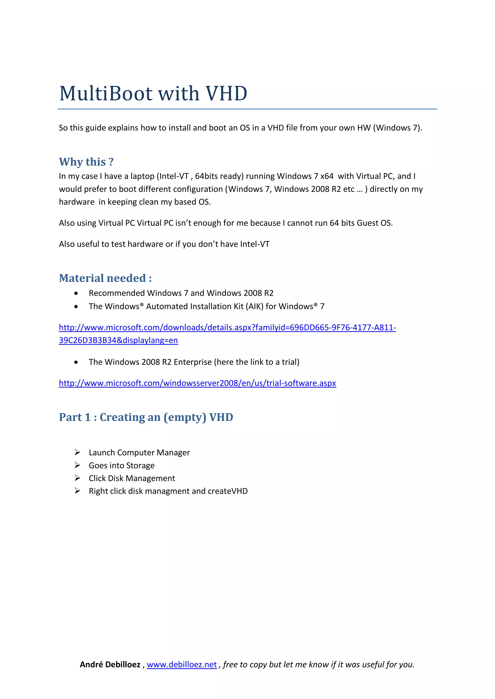 This document explains how to install and boot operating systems from virtual hard disk (VHD) files on your own hardware running Windows 7. It involves creating an empty VHD file, using the Windows Automated Installation Kit to prepare the VHD with an OS installation image, and modifying the boot menu to allow booting from the VHD. This allows testing different OS configurations directly on your hardware without needing virtualization software or dedicating a whole system to a virtual machine.