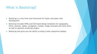 Bootstrap is a free front-end framework for building responsive, mobile-first websites. It includes HTML and CSS templates for common elements like typography, forms, buttons, navigation, tables, images and more. Bootstrap also utilizes a responsive 12-column grid system and is compatible with all modern browsers. Websites built with Bootstrap are automatically responsive on devices ranging from small phones to large desktops.