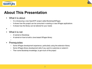 This document provides an introduction and overview of the Bootstrap4XPages project, which brings the popular Bootstrap front-end framework to XPages applications. It discusses consuming the library by enabling the required libraries and themes. Contributors can extend the project by writing custom renderers, themes, and components. The goals of the project are to make Bootstrap easily consumable in XPages with minimal work, provide a ready-made responsive design template, and foster an active community around the library.