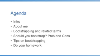 This document summarizes a presentation about bootstrapping startups. It discusses what bootstrapping means, why founders may need to bootstrap, when they can stop bootstrapping, important related terms like burn rate and runway, tips for bootstrapping like increasing revenue and reducing expenses, and the importance of doing homework like calculating burn rate and planning milestones to extend the startup's runway before fundraising. The presenter is the CEO of BasharSoft, a company he co-founded and bootstrapped for several years before raising a Series A round.