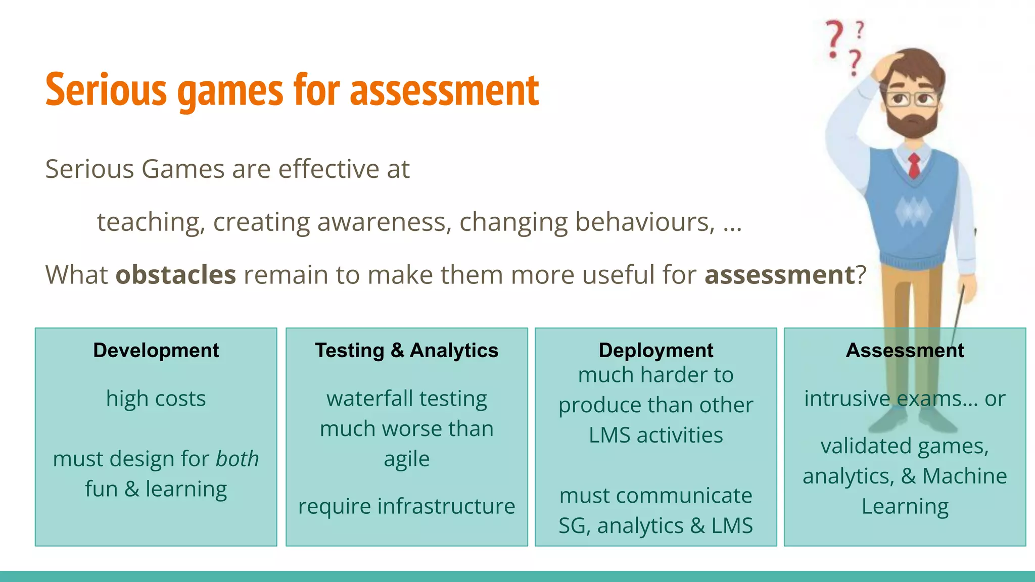This document summarizes research on using serious games to assess learning through analytics. It discusses how games can be validated using pre-post tests to ensure effectiveness and provide training data for machine learning models. Interaction data from validated games can then train models to predict learning from gameplay without exams. The researchers developed tools like a game analytics tracker, validation tool, and analysis tool to facilitate collecting interaction data, validating games, and analyzing results. Their authoring tool integrates these analytics capabilities. Future work will integrate machine learning models into the validation tool to directly provide assessment scores based on interaction data. The goal is to close the assessment loop for serious games.