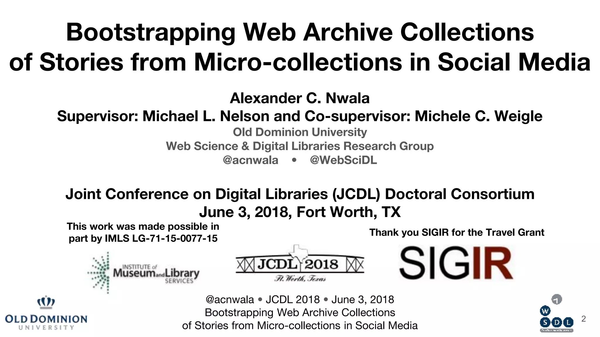 - Preliminary work involved developing a system to generate seeds from various social media sites and comparing them to curator-generated Archive-It seeds. Social media seeds were found to be comparable to Archive-It seeds.