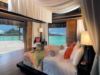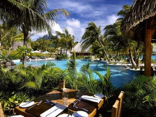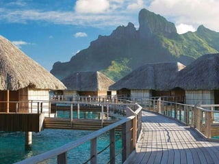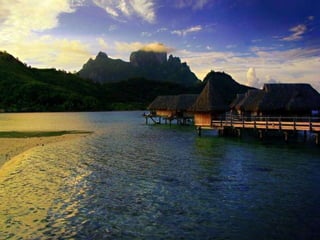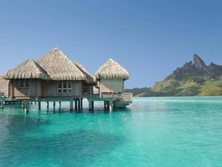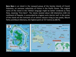 Bora Bora is an island in French Polynesia located northwest of Papeete, surrounded by a lagoon and barrier reef. In the center are the remnants of an extinct volcano with two peaks, Mount Pahia and Mount Otemanu, reaching 727 meters tall. The island has a warm, marine-tropical climate year-round being located 17 degrees south of the equator.