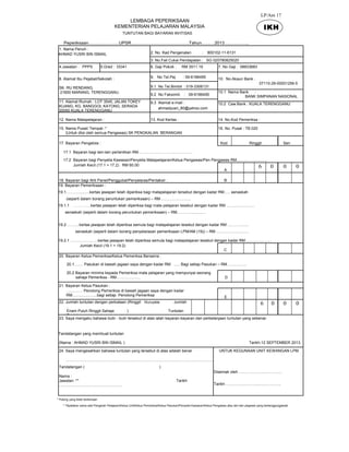 Dokumen ini adalah tuntutan bayaran ikhtisas peperiksaan oleh Ahmad Yusri bin Ismail, pegawai di SK Ru Rendang, Terengganu, bagi tahun 2013. Maklumat yang disertakan termasuk butir peribadi, pengesahan tuntutan, dan perincian bayaran bagi tugas-tugas pemeriksaan yang telah dijalankan. Jumlah tuntutan adalah RM 60.00, dan dokumen ini ditandatangani dan disahkan oleh Ahmad Yusri serta pegawai yang bertanggungjawab.