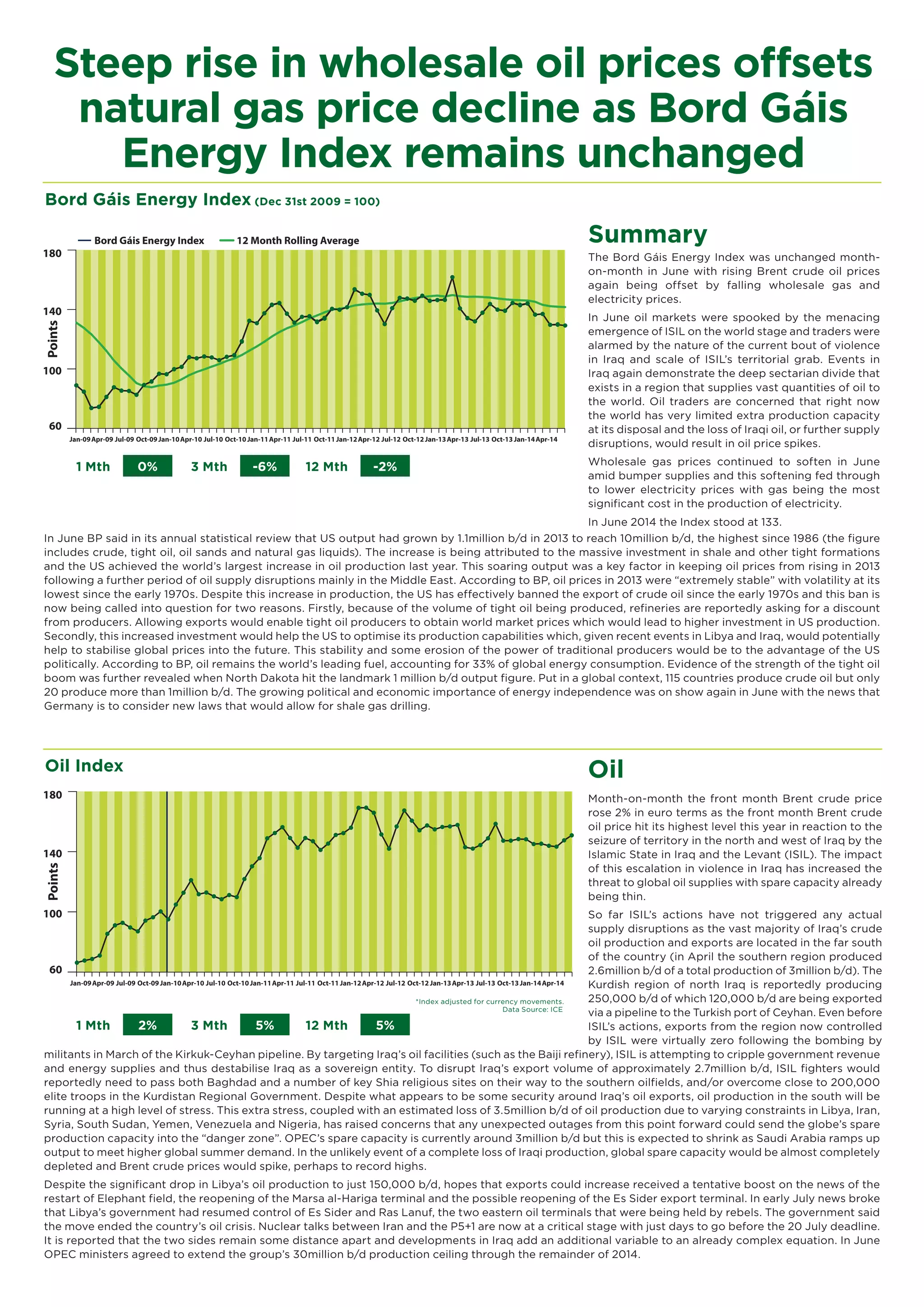 - Brent crude oil prices rose in June due to escalating violence in Iraq from the militant group ISIL seizing territory, raising concerns over global oil supply stability. However, the majority of Iraq's oil production and exports so far remain unaffected.