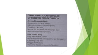 This document discusses factors to consider when evaluating borderline cases in orthodontics that are between requiring extraction versus non-extraction treatment. It outlines various clinical examinations, cephalometric evaluations, and indices used to assess tooth-size arch length deficiency, lip prominence, curve of spee, and skeletal and dental variables to determine whether extraction is necessary to achieve functional occlusion or if non-extraction can be used. Borderline cases are defined as those with permanent dentition, healthy periodontium, normal anteroposterior maxilla-mandible relationship, and where extraction may be needed to obtain stable occlusion but could impact facial aesthetics.